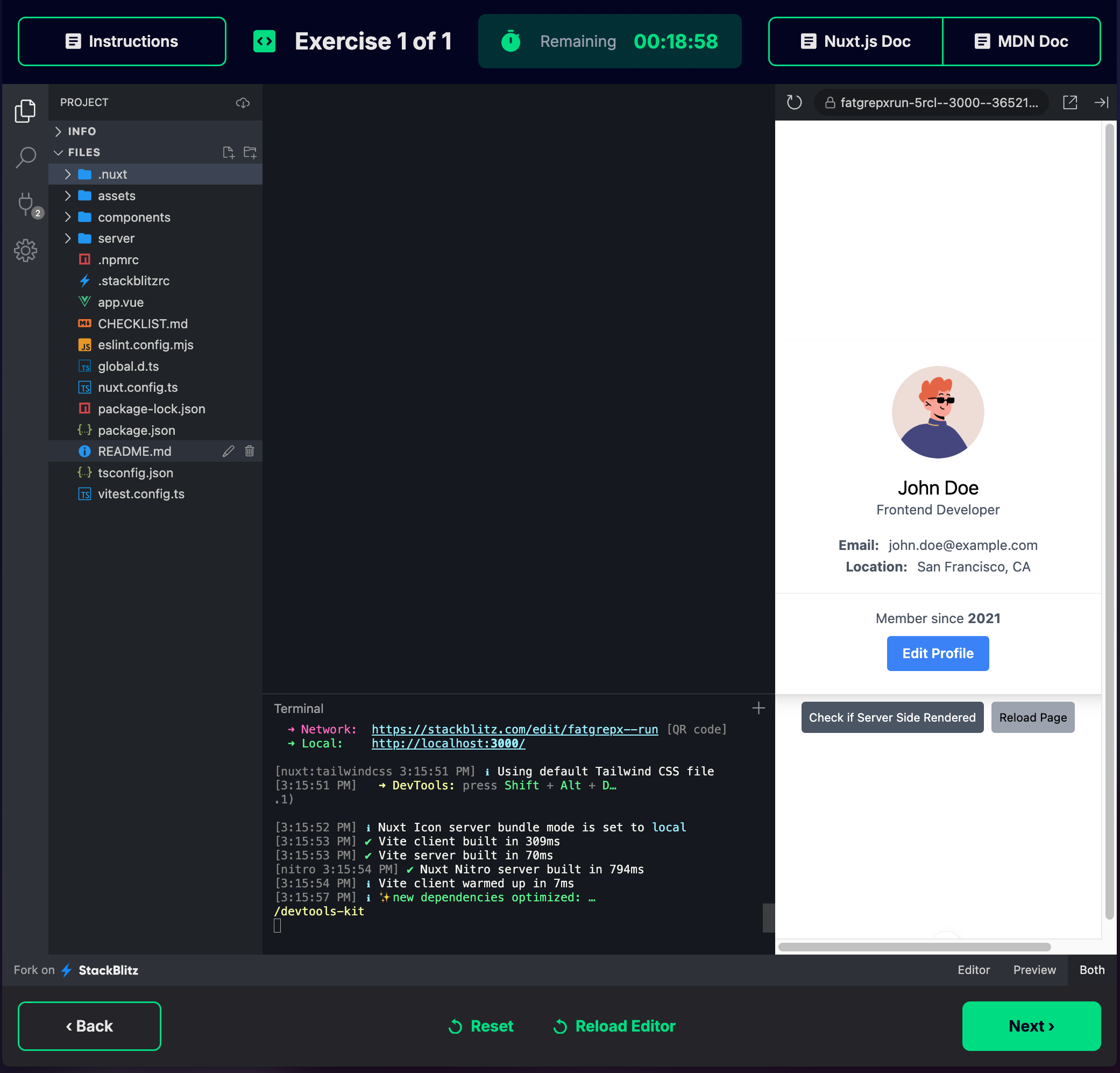 In this section, you will be working in our in-house code editor (or Stackblitz) and you can use the devtools to inspect elements or check the network tab. You also have a side panel with official Nuxt and MDN docs (since you’re not allowed to open a new tab yourself).