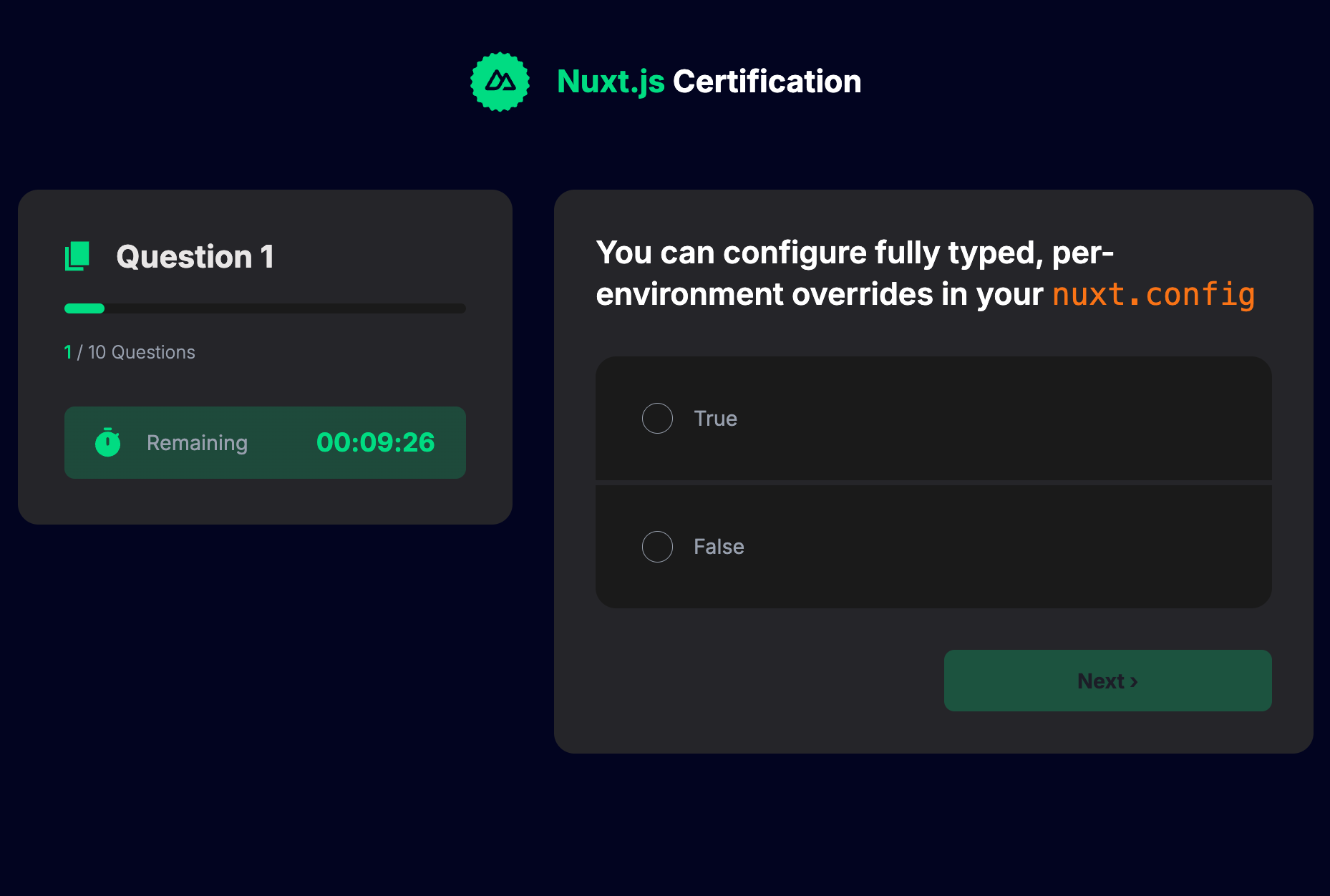 Exam questions and challenges are made in close collaboration with Sebastian Chopin, creator or Nuxt, and more Nuxt experts in the community. This involvement ensures we're testing the right competencies for you to start mastering the Nuxt Framework.